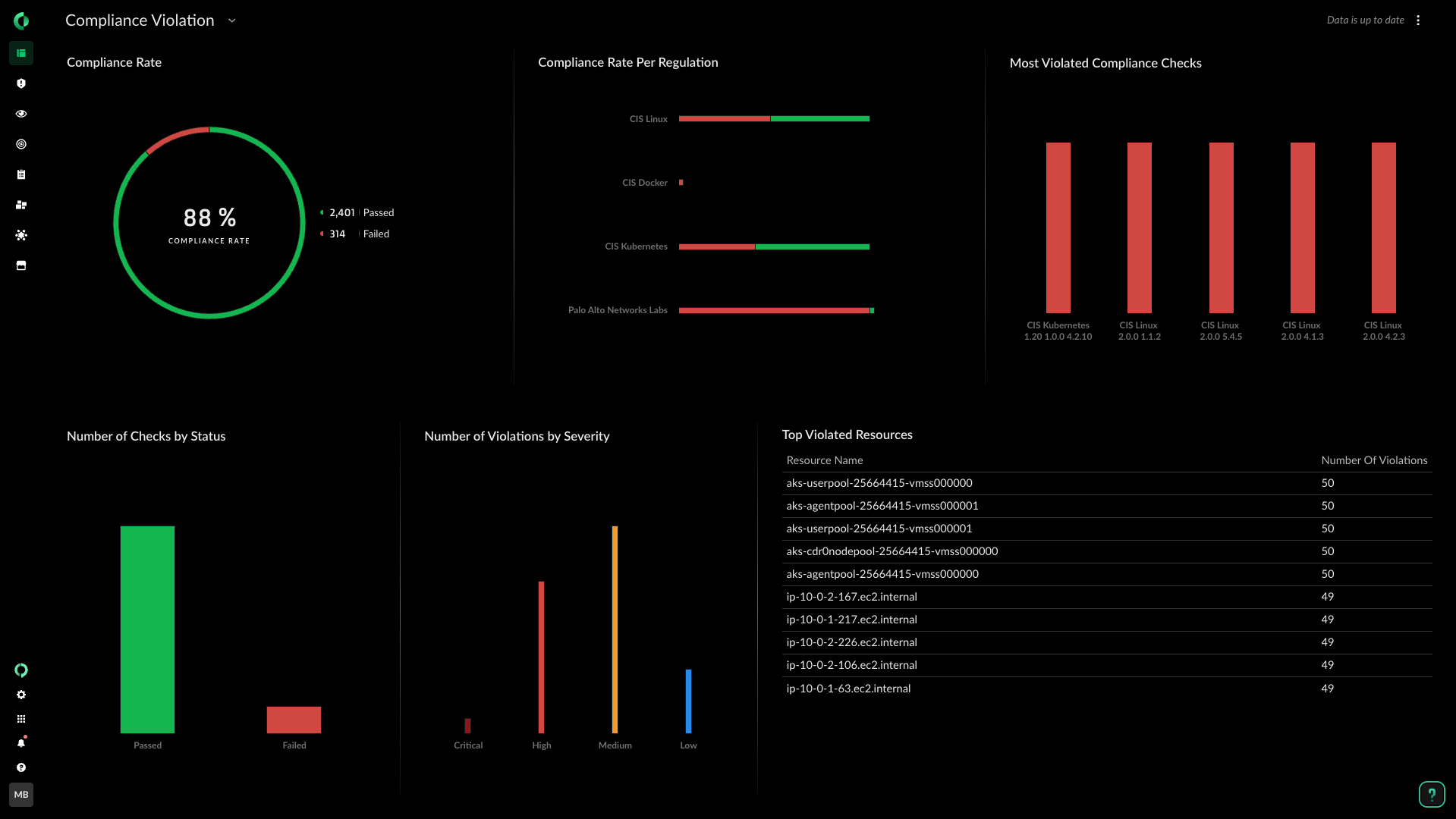 利用指导修复功能查找并修复 Kubernetes 配置错误和安全风险。针对 EKS、AKS 和 GKE Kubernetes 集群,加强 Kubernetes 态势并符合 CIS 基准。