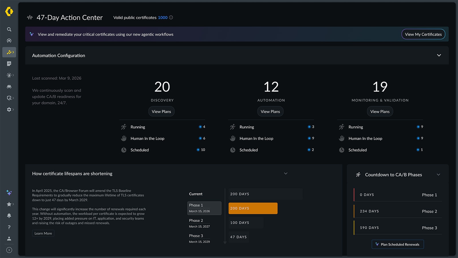 实现证书生命周期工作流程自动化,消除人工跟踪和紧急更新。在执行系统和企业工作负载之间协调签发、更新、部署、轮换和验证,在不中断生产的情况下吸收更新加速。