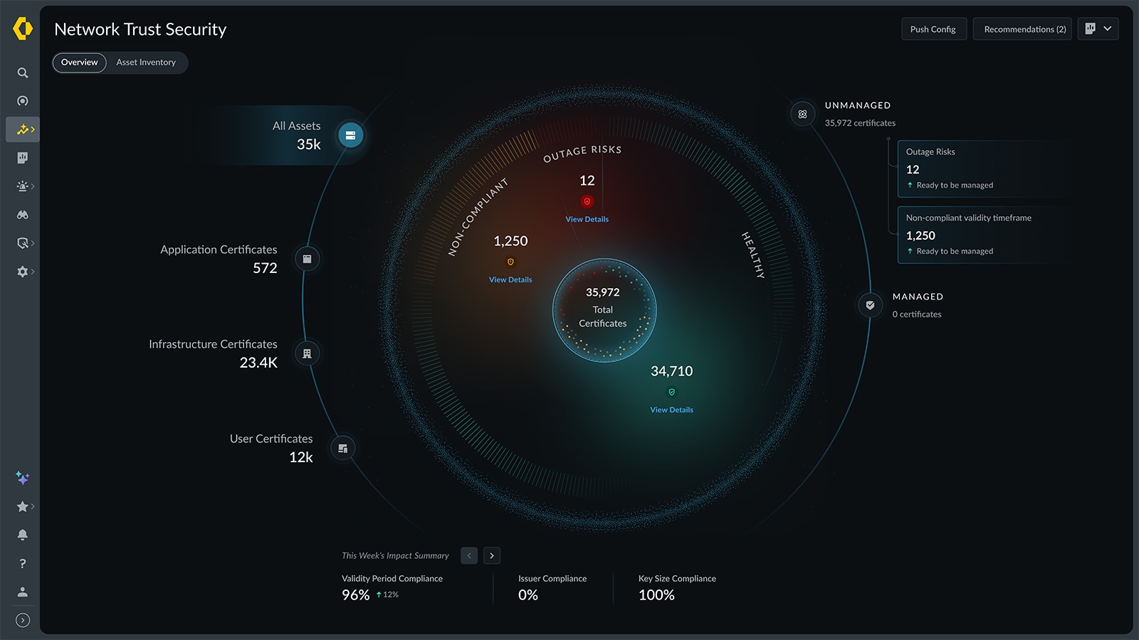 跨防火墙、远程访问网关、工作负载、Kubernetes 集群和内部系统获取统一的公共和私有证书可见性。从单一权威清单中识别所有权、过期状态、签发授权和策略调整。